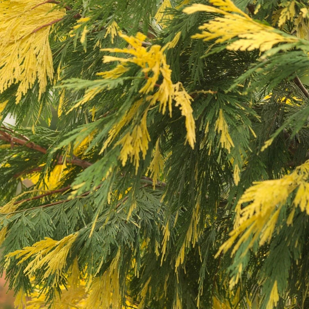 cette variété se distingue et se remarque par son feuillage vert marbré de jaune. A taille adulte il sera moins haut que l’espèce type mais garde néanmoins ses caractéristiques : croissance lente qui s’accélère avec l’âge, bois léger et rouge, écorce brune.