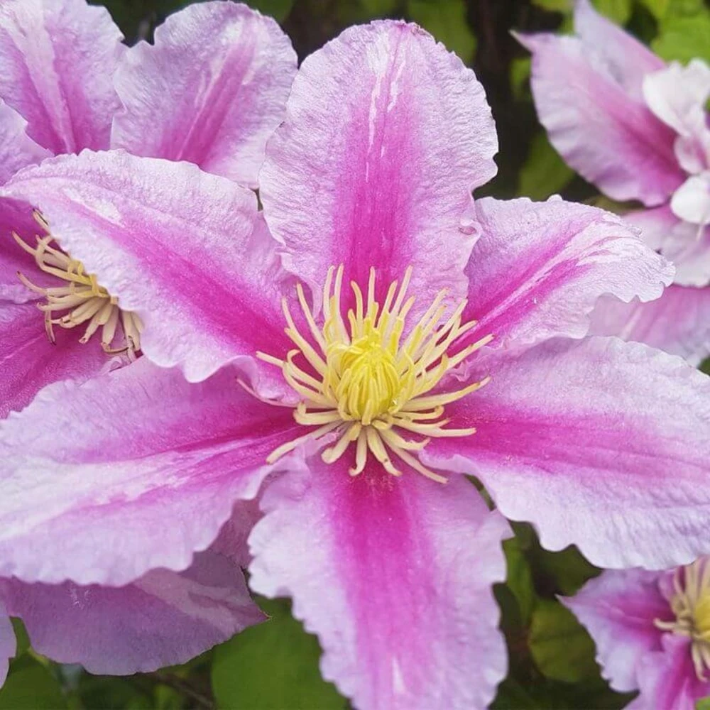 la clématite ‘carnaby’ est une variété de clématite à la floraison rose claire. Très lumineuses, ses fleurs apparaissent de mai à juin puis d’août à septembre.
