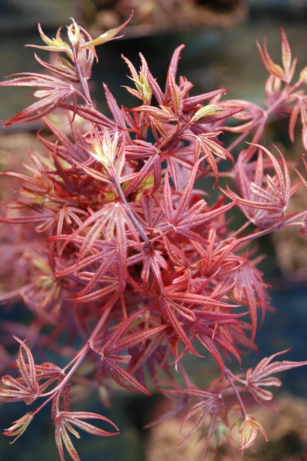 véritable feu de l’automne, la variété ‘shaina’ est un arbuste à port étalé. Son feuillage rouge au printemps lorsqu’il débourre se teinte de reflets mauves, violets et bruns en été et termine rouge carmin en automne. Il présente dès l’automne de nouvelles pousses rouges orangées. Les lobes de ses feuilles sont pointus et découpés jusqu’à la moitié du limbe : de loin, on dirait un arbre à origamis !