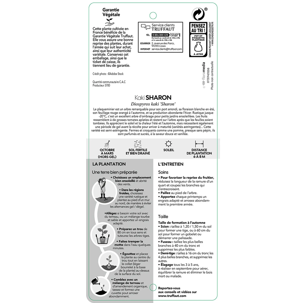 Le genre Diospyros comprend environ 450 espèces originaires des régions chaudes dont principalement l’Indonésie. Diospyros kaki (Plaqueminier ou Kaki) est l’une de ces espèces, originaire de Chine. Ce petit arbre, à cime compacte arrondie, atteint 7 m de hauteur pour une largeur de 4 m. Feuillage caduc, vert foncé, brillant dessus, plus clair et mat dessous. Belles colorations en automne, orange et pourpre. Floraison blanc jaunâtre en mai-juin. Fruits globuleux, ressemblants à une tomate, jaune à rouge orangé brillant, en octobre-novembre. A planter dans un sol profond et fertile, en situation ensoleillée et chaude, bien abritée dans les régions à hivers rigoureux. Ne nécessite aucune taille. Kaki « Sharon » est un plaqueminier productif et résistant aux fruits à peau fine et à chair jaune orange bien sucrée avec peu de pépins. A consommer plus ou moins blet. C’est la variété que l’on retrouve le plus sur les étals des marchés. Rustique à -18°C.